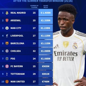 北京时间9月3日,德国转会市场发布2025/26赛季夏季转会窗口结束后最贵阵容榜单,皇马14亿欧元居首,阿森纳13.3亿...